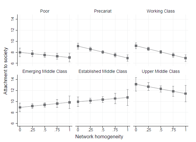 Además, la homogeneidad de las redes —es decir, relacionarse principalmente con personas de la misma clase— reduce significativamente el apego social, especialmente en los extremos de la estructura social (ver Figura 2). En particular, las clases bajas muestran menores niveles de confianza institucional y participación política cuando sus redes son más homogéneas, reforzando sentimientos de exclusión y desconfianza hacia las instituciones. En las clases altas, en cambio, la homogeneidad se asocia con una reducción en la identificación nacional y la participación cívica, lo que sugiere una forma de “pertenencia selectiva” desvinculada de la realidad de otros grupos sociales.