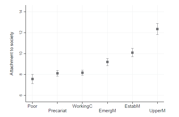 Se identifican seis clases sociales: pobre, precaria, trabajadora, media emergente, media establecida y media alta. Los resultados muestran que el apego social aumenta sistemáticamente con la posición de clase (ver Figura 1). La clase media alta presenta los niveles más elevados, mientras que la clase precaria y la trabajadora exhiben los más bajos.