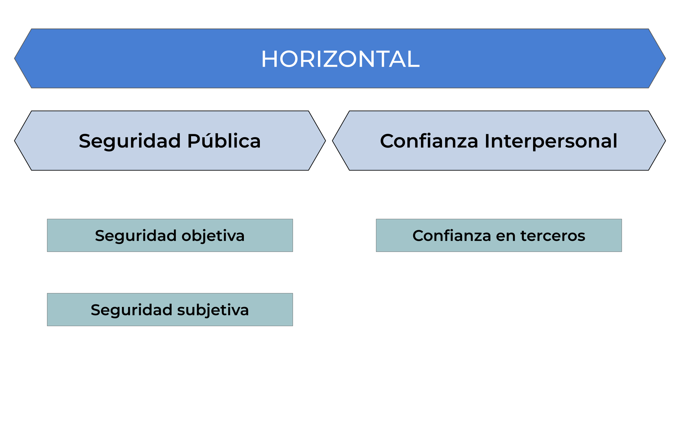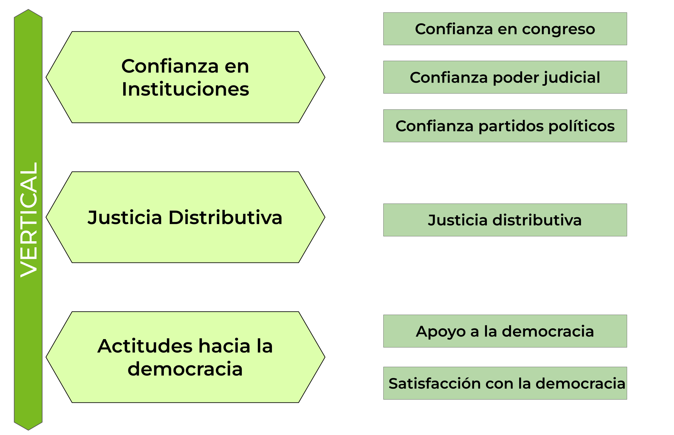 En cuanto al primer punto, se propuso un modelo conceptual que considera dos grandes áreas de cohesión social: la horizontal, que aborda las relaciones entre individuos y grupos sociales, y la vertical, que busca capturar las interacciones entre los sujetos y las instituciones de la sociedad. Mientras la horizontal considera dimensiones como la seguridad pública y la confianza interpersonal, la vertical incluye aspectos tales como la confianza en instituciones políticas, la justicia distributiva y las actitudes hacia la democracia (Iturra et al, 2025).