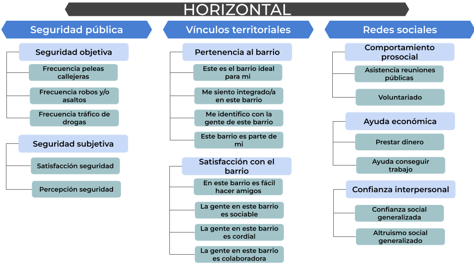 El modelo horizontal considera tres dimensiones: seguridad (objetiva y subjetiva), vínculos territoriales (pertenencia y satisfacción con el barrio) y redes sociales (confianza interpersonal, ayuda económica y comportamiento prosocial). Este esquema (Figure 1) fue puesto en acción utilizando datos del Estudio Longitudinal Social de Chile (ELSOC), una encuesta que es aplicada año a año a las personas para conocer y evaluar su opinión respecto temas sociales, culturales y políticos. Los resultados de este análisis pueden revisarse en este post anterior.